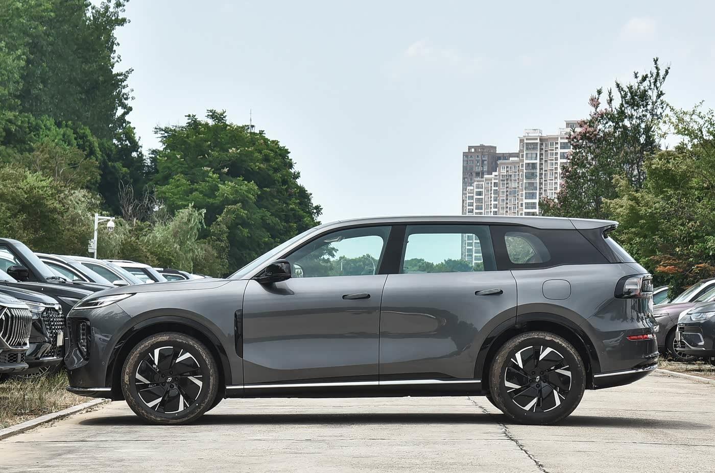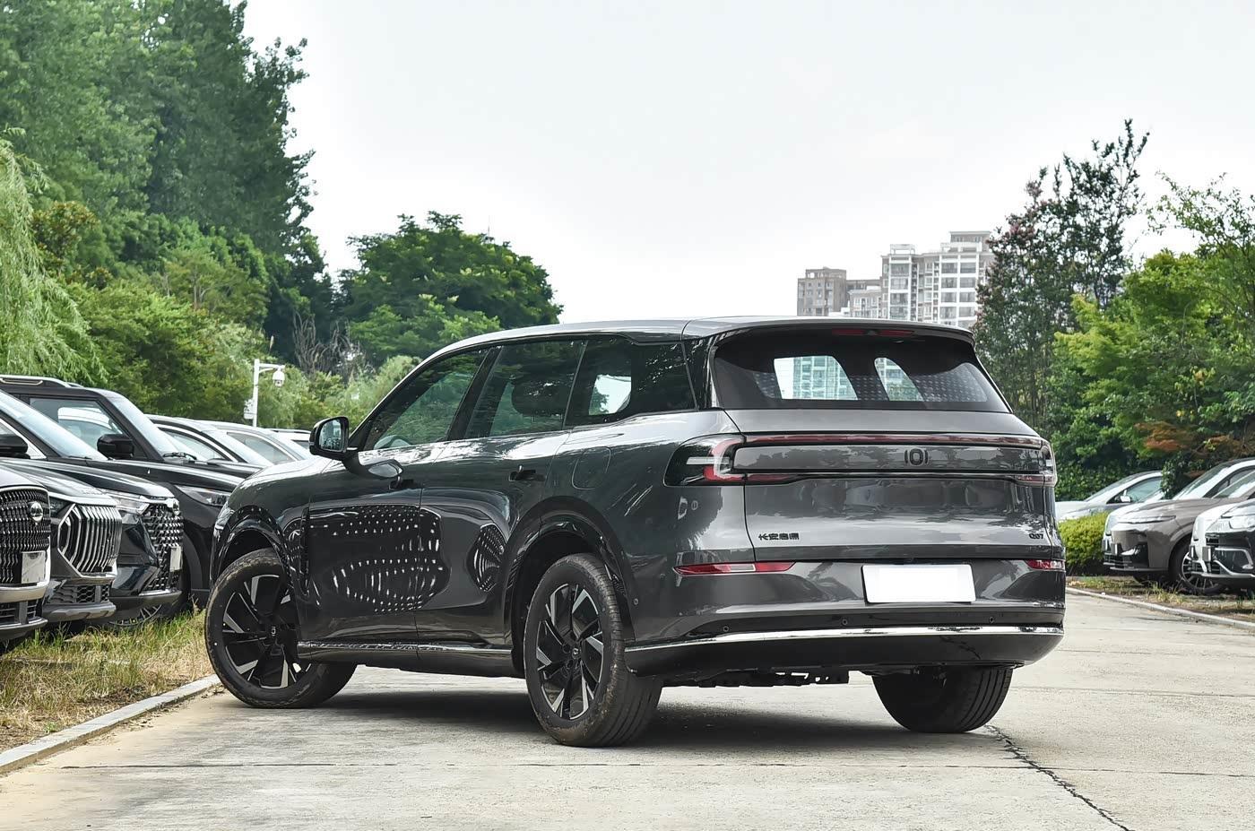 再来看车身侧面部分,车身平直厚重,尤其是没有采用溜背造型来牺牲头部空间,而无框车门采用双层夹胶玻璃,隔音性能媲美传统有框设计,好看还实用,车门部分的腰线突出饱满,结合下方的内凹造型,层次感很出色,而轮眉与侧裙的黑色防刮材质兼顾实用性与越野风格。隐藏式电动门把手与黑色钢琴漆窗框形成视觉连贯性,搭配20英寸低风阻轮毂,营造出运动轿跑SUV的俯冲姿态。车身尺寸达4837×1920×1690mm,轴距2905mm,超越比亚迪宋L DM-i(2782mm)等竞品。后排腿部空间可轻松容纳身高180cm乘客,且纯平地台设计提升三人乘坐舒适性。